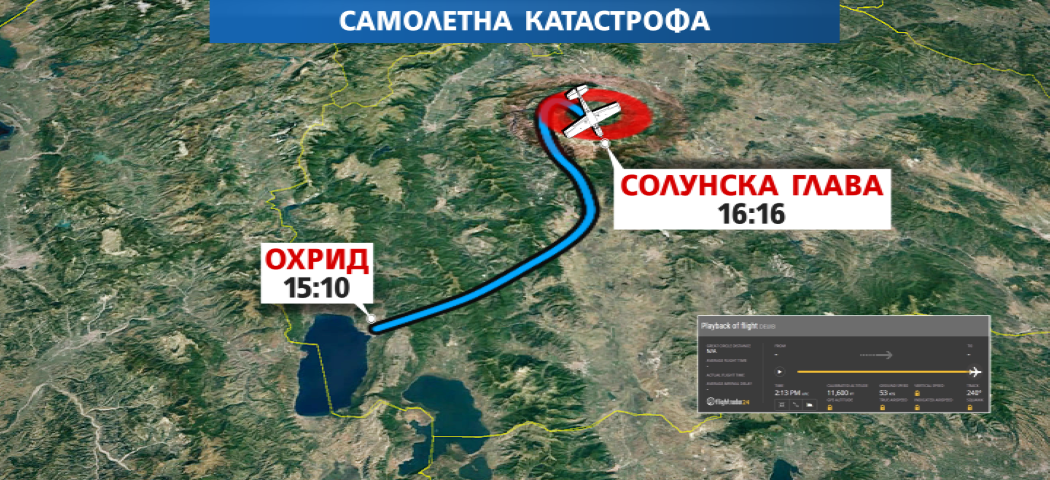 Машината изчезна от радарите малко повече от час след  началото на полета си и се издирваше от два полицейски хеликоптера. Самолетът тип „Чесна P-210″ е излетял от летището в Охрид в 15.10 местно време за София. В 16.16 часа обаче контактът с него се губи. „Поради лошите метереологични условия пилотът е поискал да кацне в Скопие, но малко по-късно е поискал разрешение да продължи към София“, каза Николче Тасески от въздушния контрол.