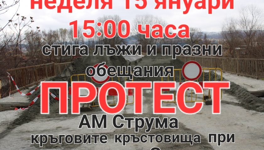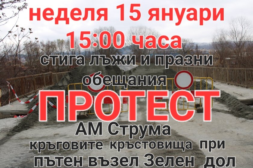 Припомняме, че това ще е втори протест заради затварянето на Покровнишкия мост. Първият се проведе на 13-ти май 2022 г., като тогава за кратко бе спряно движението при пътния възел. Блокадата тогава бе вдигната заради уверение от страна на Агенция „Пътна инфраструктура“, че предстои започване на строителни дейности, но това така и не се случи.