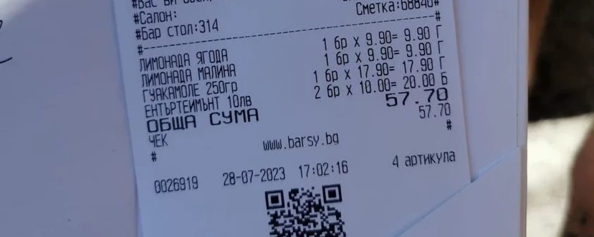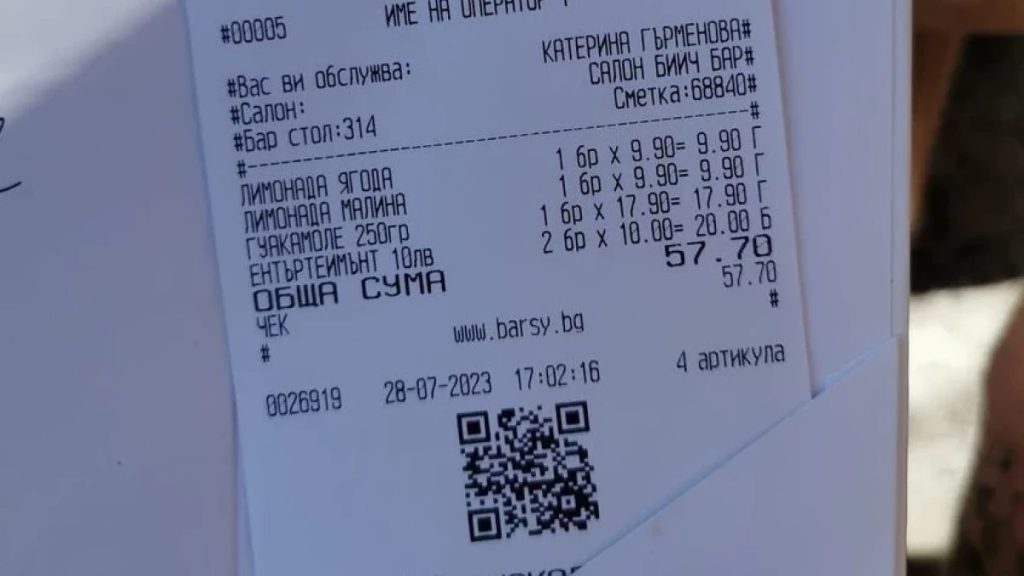 „Абсолютно никаква жива музика или каквото и да било участие! Било „нещо като вход“ Но, на входа не пише нищо! Такса ЕНТЪРТЕЙНМЪНТ… На съседната маса имаше 12 момчета, 120 лв ЕНТЪРТЕЙНМЪНТ! Нормално ли е??? На бийч бар?“, допълва Зандра, която показва снимана касова бележка от търговския обект. Бележката предизвиква допълнително възмущение понеже въпросната такса освен, че е изписана с чуждица, има и правописна грешка.