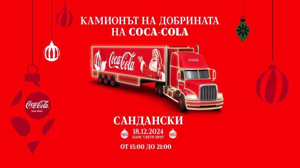 Камионът на добрината на Coca-Cola идва при теб! Посети Коледното градче на Coca-Cola и превърни празниците в магично приключение с много настроение, изненади и споделени моменти. Ще бъдем в Сандански на 18.12.2024 в парк “Свети Врач” от 15 до 21 часа.