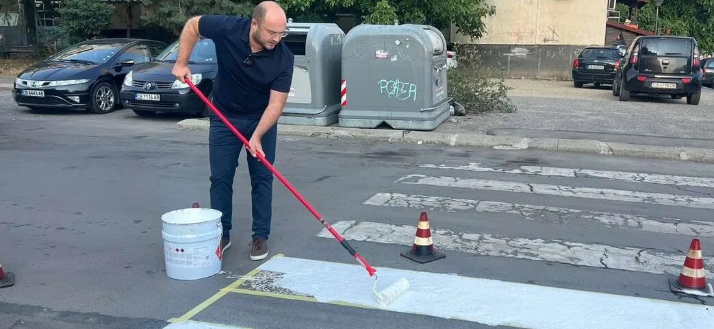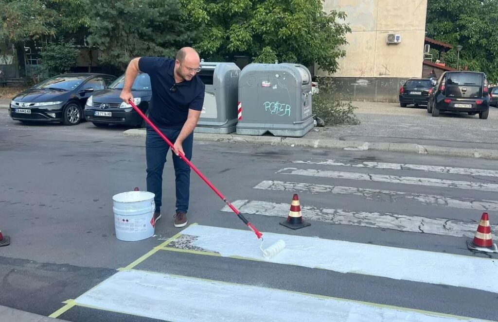 „Затова след като викахме неволята без успех, се принудих сам да боядисам пешеходната пътека пред 68 СУ “Акад. Никола Обрешков” в Дружба. Призовавам Васил Терзиев да си свърши работата и да намери решение на проблема, който самият той създаде и да не оставя децата на София на произвола, без пътна маркировка, знаци и пешеходни пътеки, които да ги пазят. Безопасността на децата няма цвят и няма партийна принадлежност, тя трябва да бъде над всичко. Ако ръководството на общината продължава да бездейства, с десетките граждани, които ми пишат с оплаквания по темата, започваме сами да боядисваме пешеходните пътеки пред училищата“, заявява още Георги Георгиев. | БГНЕС