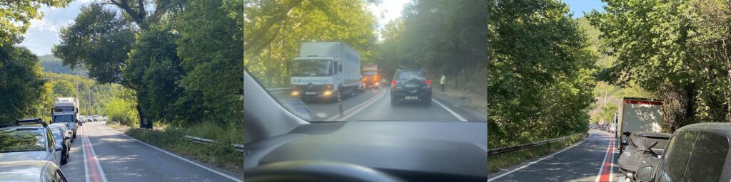 Движението се извършва в една лента, като опашката започва от град Кресна, а от другата страна почти до бензиностанцията.