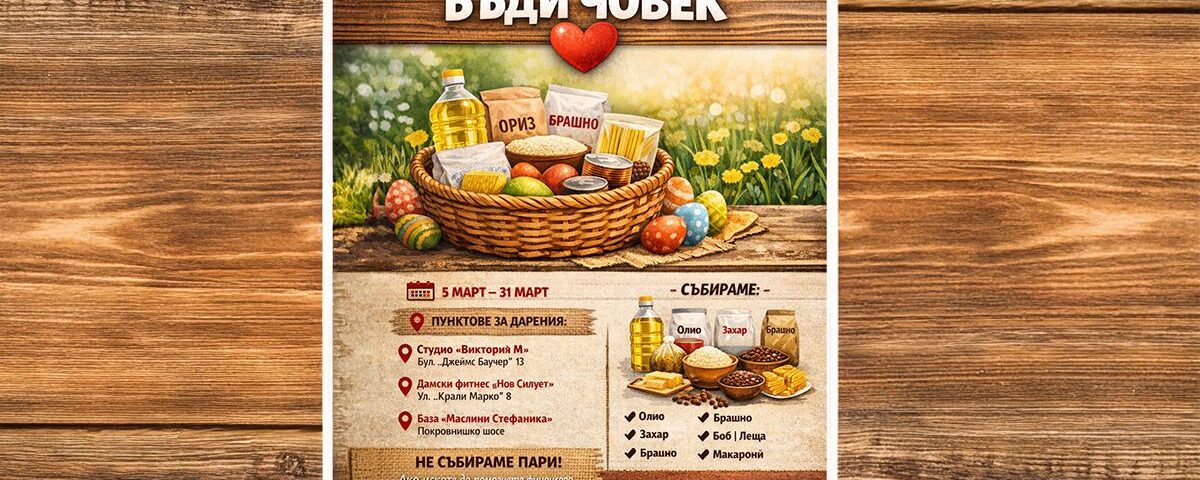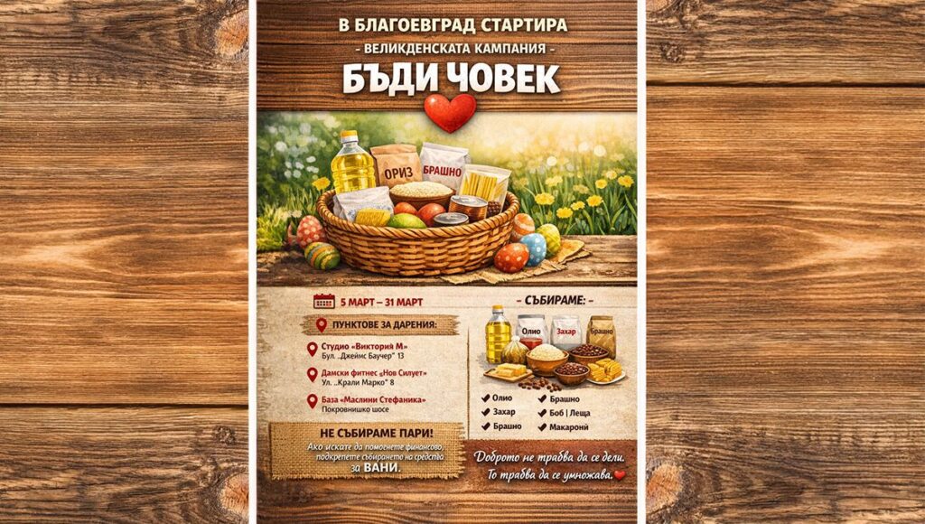 Млади доброволци в Благоевград започват за поредна година великденската благотворителна кампания „Бъди човек“ Благоевград, насочена към подкрепа на възрастни хора и семейства в нужда.