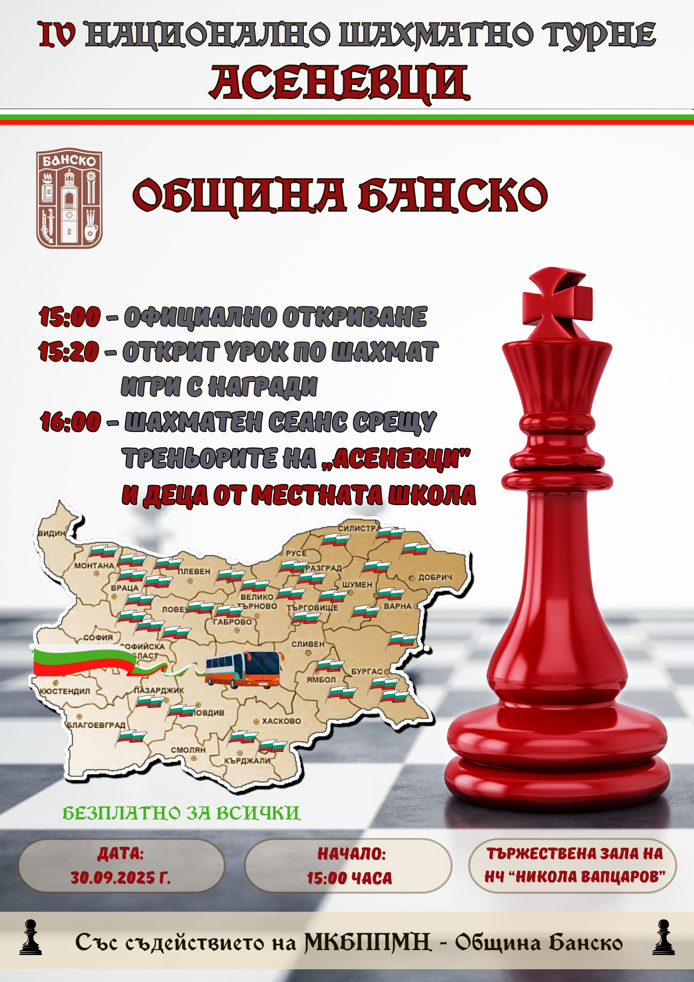 Банско днес става арена на интелектуални битки, като е домакин на четвъртия кръг от Националното шахматно турне „Асеневци“. Събитието е част от най-мащабния проект за популяризиране на шахмата у нас и се организира от Шахматен клуб „Асеневци“ – Велико Търново, съвместно с Местната комисия за борба с противообществените прояви на малолетни и непълнолетни към Община Банско.