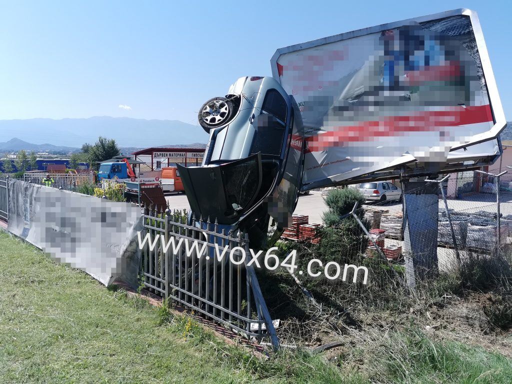Щетите са материални по автомобила, ударен стълб и билборд, както и бутната ограда.