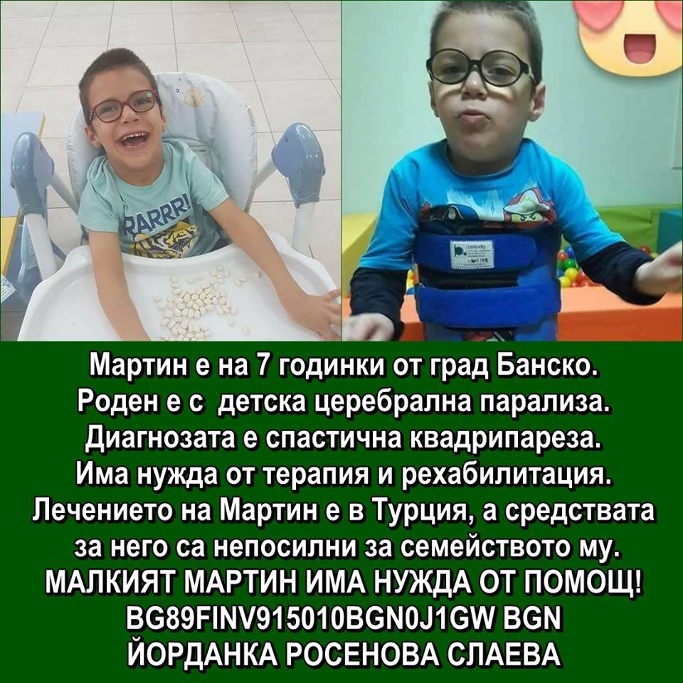 Можеш да помогнеш на Мартин, като направиш дарение по сметка c IBAN BG89FINV915010BGN0J1GW с бенефициент Йорданка Росенова Слаева.