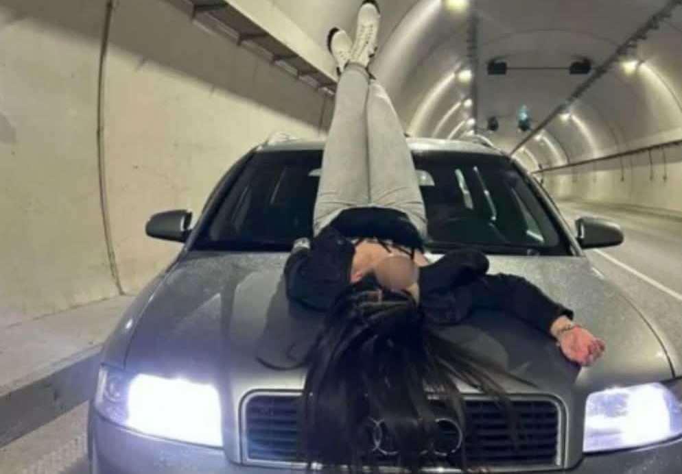На публикуваните снимки се вижда момичето, което позира пред спрян лек автомобил „Ауди А4“ с габровска регистрация. Колата е разположена в тунел, което създава сериозна опасност за останалите участници в движението.