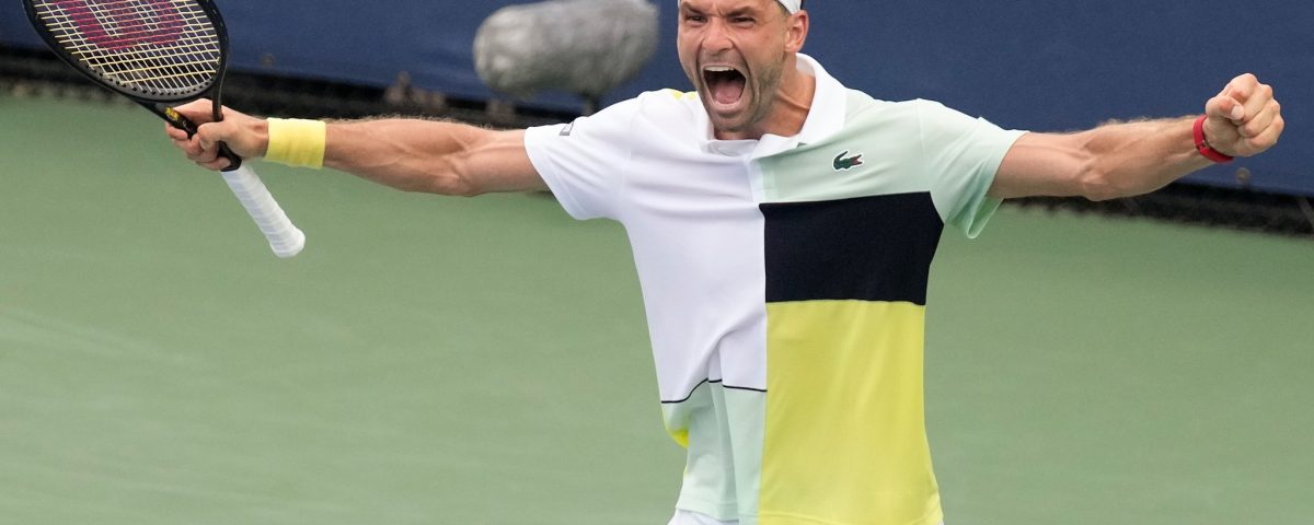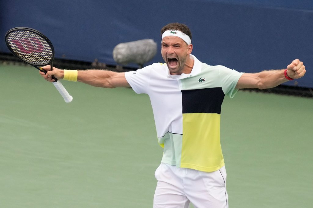 Grigor Dimitrov, of Bulgaria, reacts after defeating Alex Molcan, of Slovakia, during the first round of the U.S. Open tennis championships, Tuesday, Aug. 29, 2023, in New York. (AP Photo/Charles Krupa)