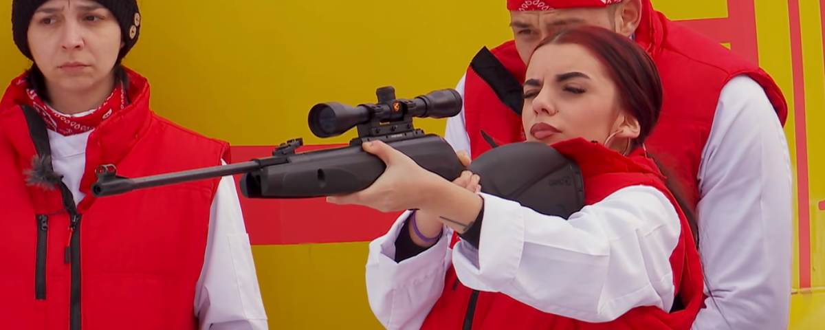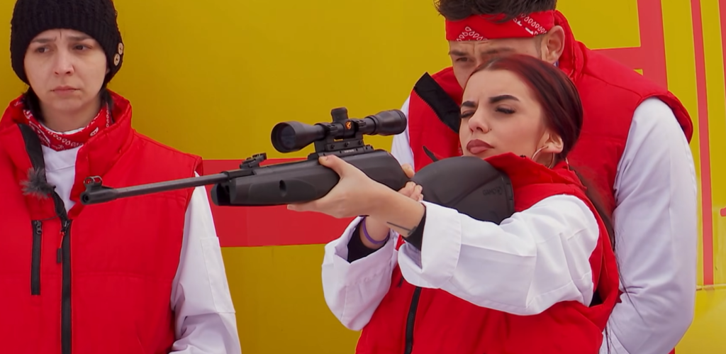 Момичето за първи път хвана пушка и никой дори не си помисли, че тя ще направи точна стрелба. Но късмета на начинаещия проработи и тя успя да свали две кенчета.