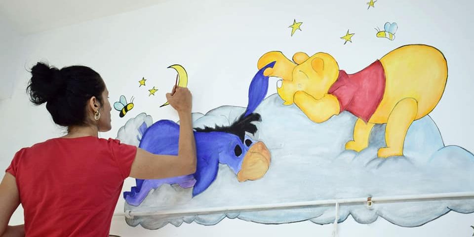 След като отделението бе спасено, от няколко дни художничката Силвия превръща белите стени в свои платна – доброволно и безвъзмездно.
