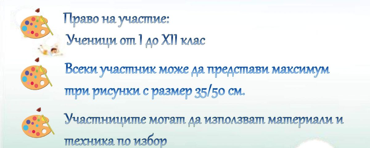 Право на участие в конкурса имат всички ученици от I до XII клас. Всеки участник може да представи максимум три рисунки, специално създадени за конкурса. Размер на творбите – 35/50 см. Участниците могат да използват материали и техника по избор.