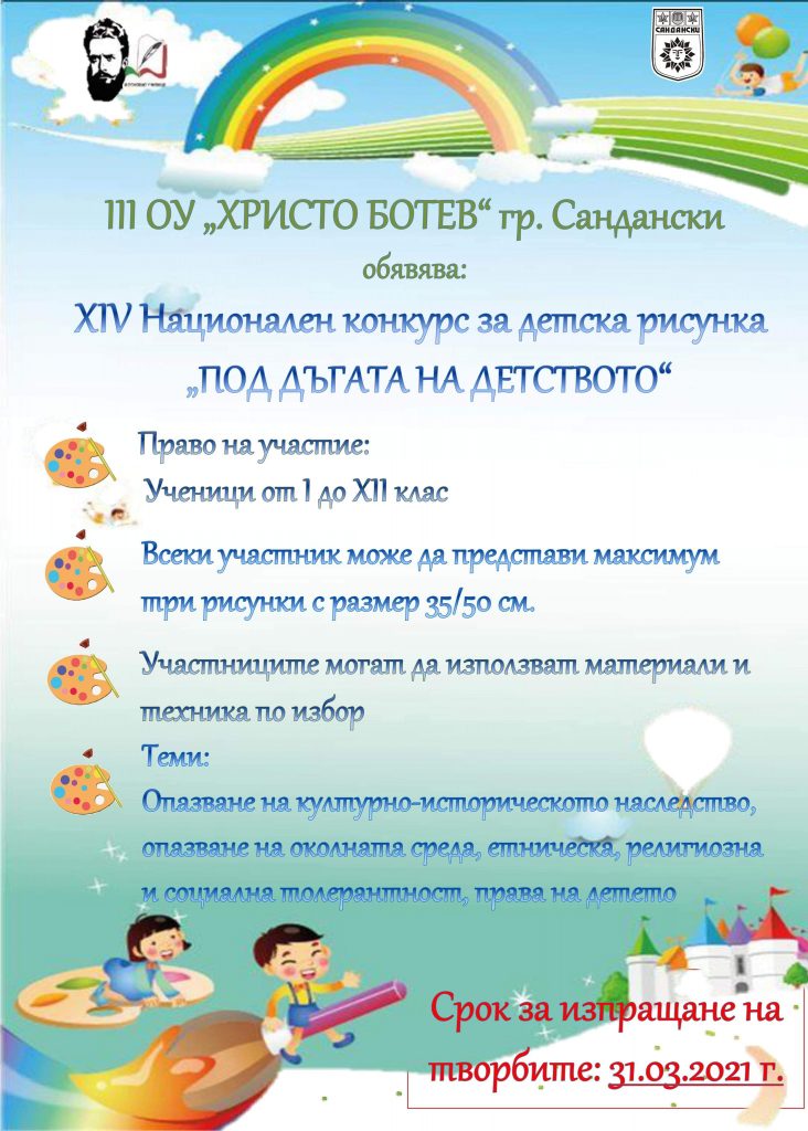 За да се стимулират и развиват способностите на деца с изявени дарби в областта на изобразителното изкуство, за 14-та поредна година III ОУ „Христо Ботев“ и община Сандански организират НАЦИОНАЛЕН КОНКУРС ЗА ДЕТСКА РИСУНКА „ПОД ДЪГАТА НА ДЕТСТВОТО“.
