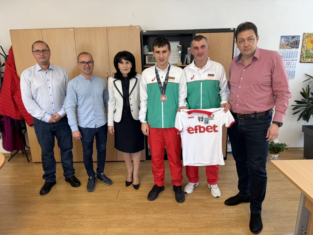 Иван Божинов и личният му треньор Александър Трайков получиха поздравления от кмета за впечатляващия успех.
