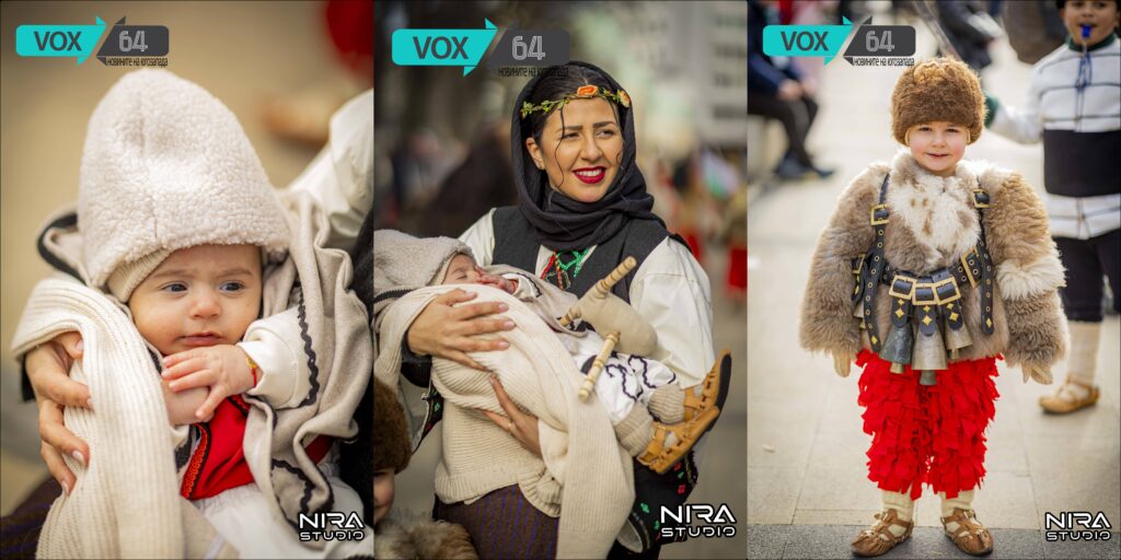 Уникален и дълбоко трогателен кадър от Сурва 2026 разбуни социалните мрежи и стопли сърцата на хиляди българи. На снимката, заснета от екипа на NiRa Studio за VOX64.com, се вижда млада майка в сияйно красива българска народна носия, държаща своето двумесечно бебе в прегръдките си. До нея стои и по-големият ѝ син — малкият Лъчезар, който на едва четири години за втори път попада пред обектива на нашия екип.