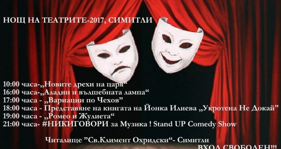 17:00 часа ,,Вариации по Чехов“, 18:00 часа публиката ще се наслади на  представяне на книгата на Йонка Илиева ,,Укротена Не Докрай”. Уникалното представление ,,Ромео и Жулиета“ на театрална школа „Ер малък“ ще покаже интересния прочит на режисьора Бранимир Митов на Шекспировата трагедия. 21:00 часа ще бъде времето, когато  смехът ще е на първо място , #НИКИГОВОРИ за Музика е Stand UP Comedy Show, която ще Ви накара да се смеете до сълзи. И всичко това в читалището в Симитли, а входът за всички представления е напълно СВОБОДЕН !!!