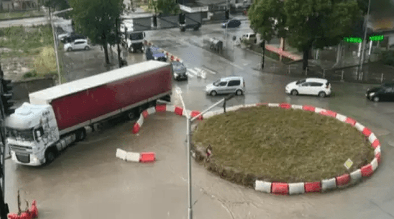 Вече 8 години едно от най-натоварените кръстовища в Благоевград функционира като временно кръгово. Или поне докато не завали проливен дъжд и пластмасовите ограничители не блокират движението в участъка